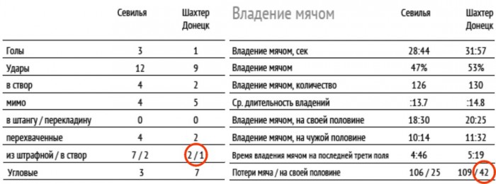 Казалось бы, общая статистика игры не столь печальна для «Шахтера». За счет активности в середине первого тайма гости даже несколько превзошли соперника в объеме владения мячом, в том числе в атаке. Однако лишь 2 удара в створ при двух, нанесенных из пределов штрафной соперника, наглядно отображают проблемы «Шахтера» в нападении. 42 потери мяча на своей половине поля при в среднем 21 потере за матч в играх плей-офф и вовсе выглядят антирекордом.