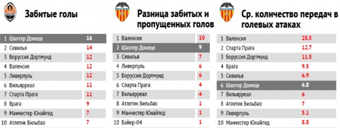 «Шахтер» - команда, забившая в плей-офф Лиги Европы наибольшее число мячей. По разнице забитых и пропущенных мячей «горняки» уступили лишь «Валенсии». Среднее число передач в голевых атаках составило около 7, по показателю владения мячом (в среднем 49%) «Шахтер» находится в середине таблицы участников весенней стадии. Это говорит о том, что «горняки» чаще и более эффективно действовали в реализации быстрых и вертикальных атак, не делая ставку на контроль мяча.