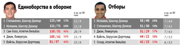 Отметились высокими персональным достижениями и игроки «Шахтера». Так, Степаненко и Исмаили возглавили список игроков, наиболее успешно действовавших в единоборствах атаки и отборах: