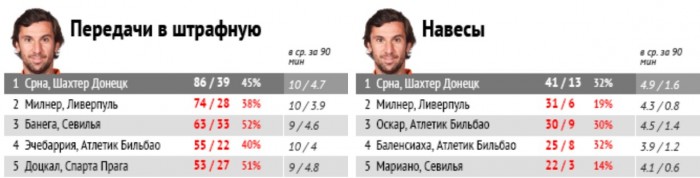 Дарио Срна стал самым результативным игроком Лиги Европы в числе передач в штрафную и навесов. В этом он на позиции защитника превзошел всех атакующих игроков: