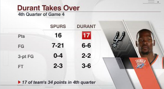 Четвертый матч серии превратился в избиение «Сперс». 111:97 итоговая победа подопечных Билли Донована. После стартового рывка гостей хозяева за две четверти сумели догнать «Сан-Антонио». А четвертая четверть стала бенефисом Кевина Дюранта. В последней четверти форварда набрал 17 очков – на одно больше, чем вся команда «Сперс».