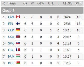 Судьба первого места группы В решится завтра в матче Канада - Финляндия