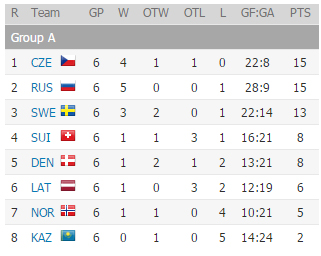 Так всё и закончилось. Сборная России одержала пятую победу подряд. Сравнялась с чехами по очкам, которые завтра сыграют со швейцарцами. А команда Знарка зарубится со шведами. Кто наберёт больше очков, тот и станет первым в группе. При равенстве преимущество будет у чехов, которые победили россиян в первом матче (3:0).