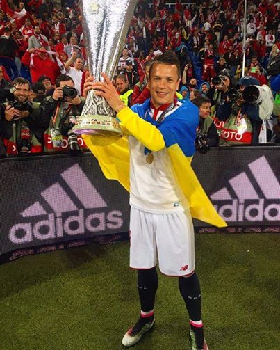 Хавбек «Севильи» позирует с кубком и украинским флагом