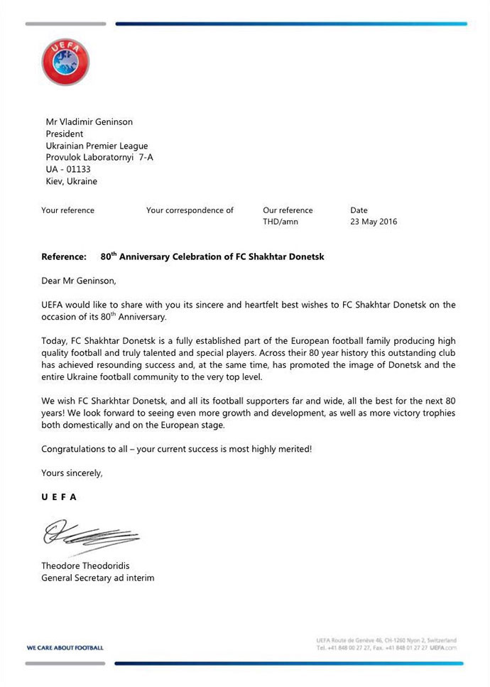 В адрес президента Премьер-лиги Владимира Генинсона поступило письмо от и.о. генерального секретаря УЕФА Теодора Теодоридиса по случаю 80-летия ФК «Шахтер» Донецк.