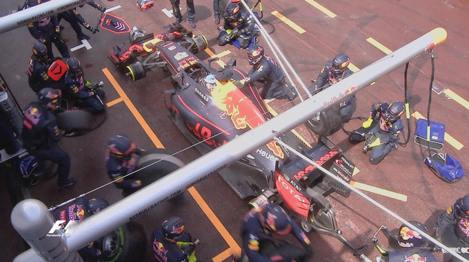 Траса, а точніше гоночна траекторія, стрімко підсихала і їзда на дощовому комплекті втрачала сенс. Зокрема, Ріккардо проїжджав кола на кілька секунд швидше за Хемілтона і вже за три-чотири кола австралієць опинився у 0,7 секундах позаду британця. От тільки це Монако – обігнати триразового чемпіона шансів не було. І так тривало допоки на 32-му колі Льюіс не поїхав в бокси, де отримав комплект UltraSoft. Виявилося, що британець відкрив хвилю перевзувань на сліки. Одразу за ним на піт-лейн поїхали Росберг, Феттель, Хюлькенберг, Сайнс і Ферстаппен. На наступному ж колі в бокси звернув і Ріккардо, от тільки механіки його там не чекали… В команді сталося непорозуміння між інженерами та командою механіків, які вчасно не отримали вказівки готувати шини для Даніеля, тож австралієць змушений був чекати поки йому принесуть потрібні шини. Втрата такої кількості часу коштувала австралійцю лідерства, бо Хемілтон за цей час встиг проскочити вперед.