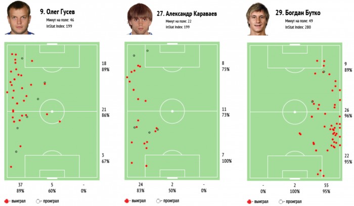 Еще одним обсуждаемым пунктом стало предпочтение Фоменко Селезнева Кравцу на месте нападающего. Согласно данным InStat Football Кравец, получивший неплохую практику в Германии, не уступает Селезневу в эффективности борьбы и точности передач. Поэтому на выбор Фоменко скорее всего повлияли уже тактические соображения. Вновь обратимся к имеющимся у нас данным разборов игр против Словении и Румынии. В создании своей тактической модели Фоменко обоснованно использует хорошо сыгранное трио центральных полузащитников «Динамо» Рыбалка – Гармаш – Сидорчук, широко используя двоих из них на выходе в атаку при расположении выше Степаненко.