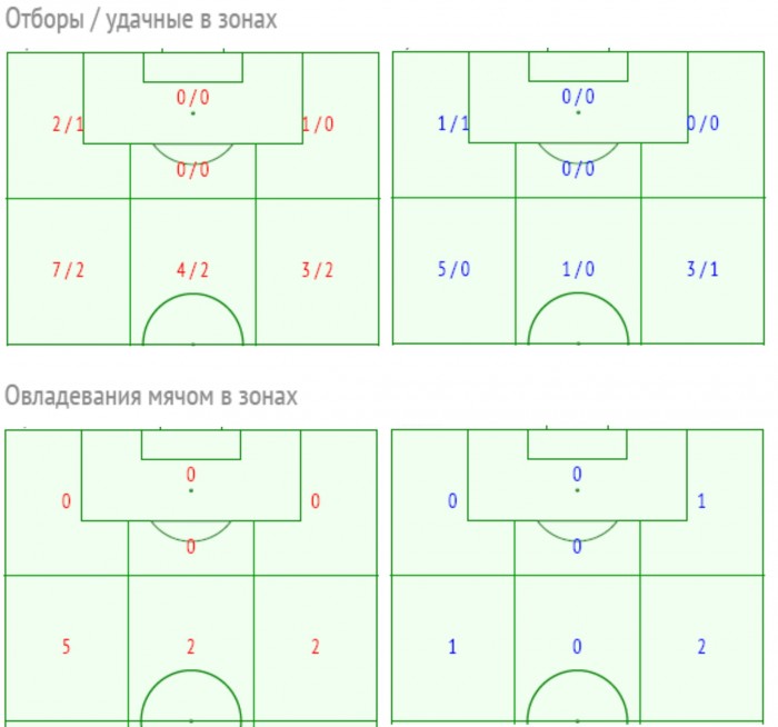 Установка на концентрацию усилий в обороне на своей половине поля отображается в малом числе оборонительных действий нашей команды за центральной линией. Даже обладая игровой инициативой, на половине поля соперника в двух прошедших играх Украина (синие) совершила гораздо меньшее число отборов, чем (Румыния красные) и овладеваний мячом в целом (Албания красные).