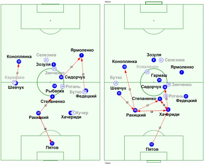 Усредненные позиции игроков сборной Украины в матчах против Румынии (слева) и Албании (справа). Вполне отчетливо сочетание игроков стартового состава, которое в прошедших играх изменилось лишь заменой Рыбалки на Гармаша. Достаточно компактны позиции центральных полузащитников, а также общее расположение по отношению к ним игроков передней линии.