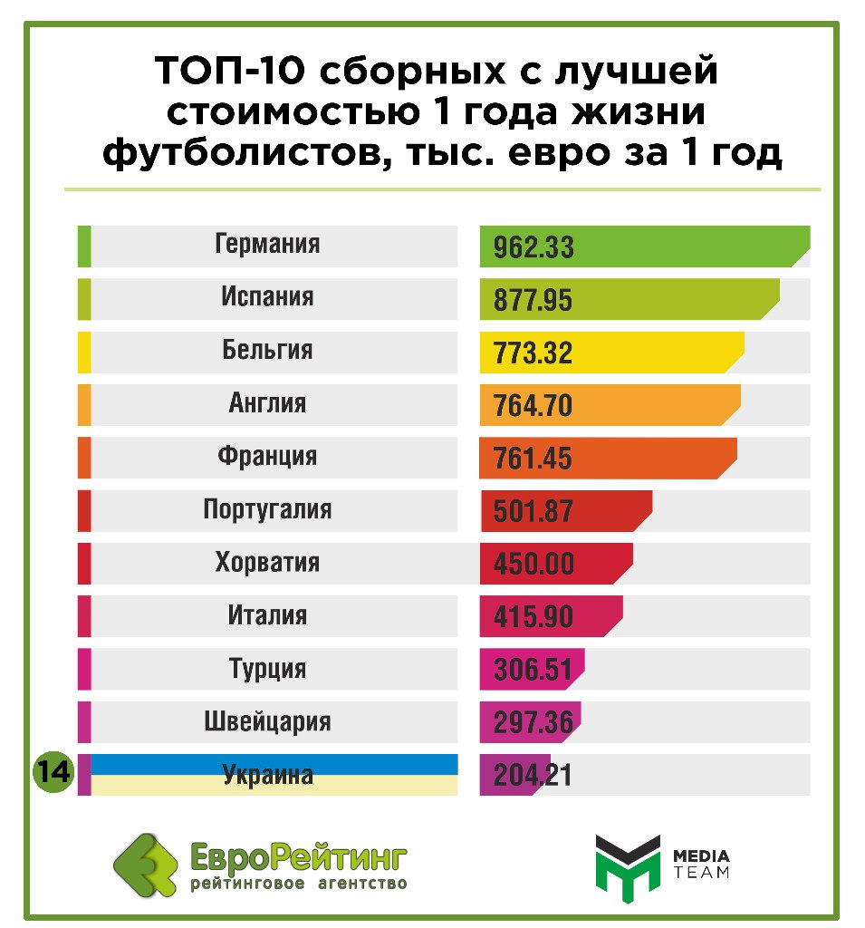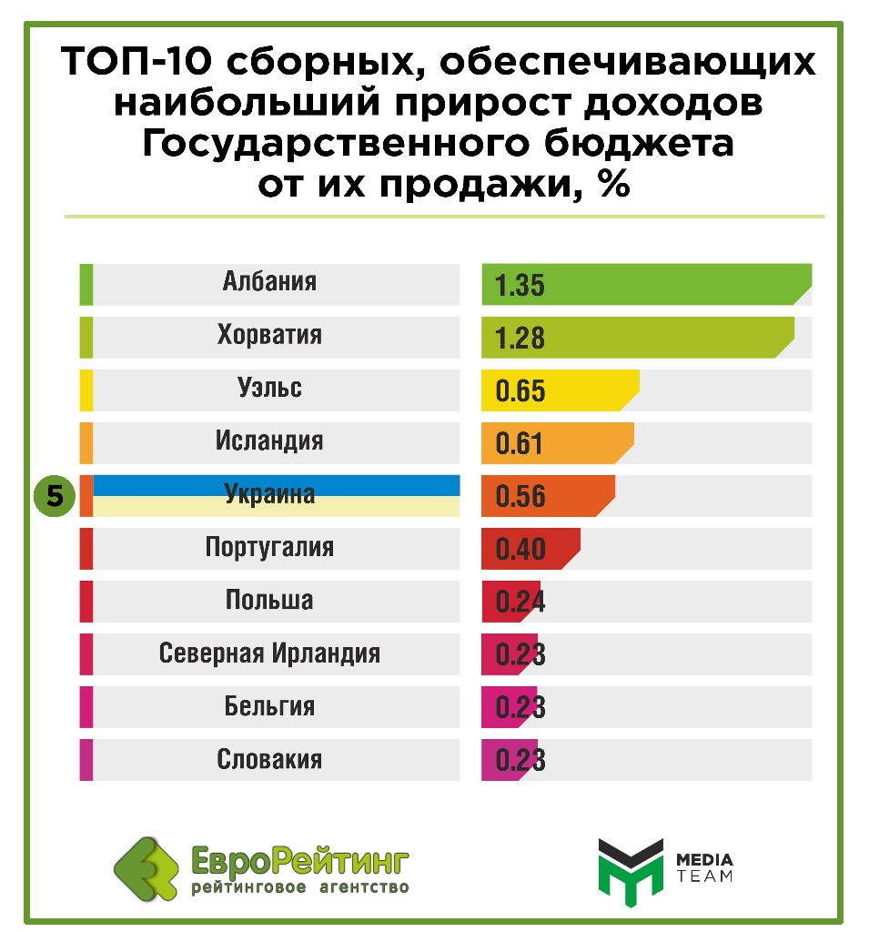 Кстати, можно наконец-то поздравить Украину: впервые мы попали в ТОП-10, причем в не самой худшей компании. Хотя то, что стоимость сборной составляет 0,11% от ВВП страны, заставляет задуматься о многом. Впрочем, пусть думают хорваты – они на первом месте. Ну, или албанцы, они на втором.