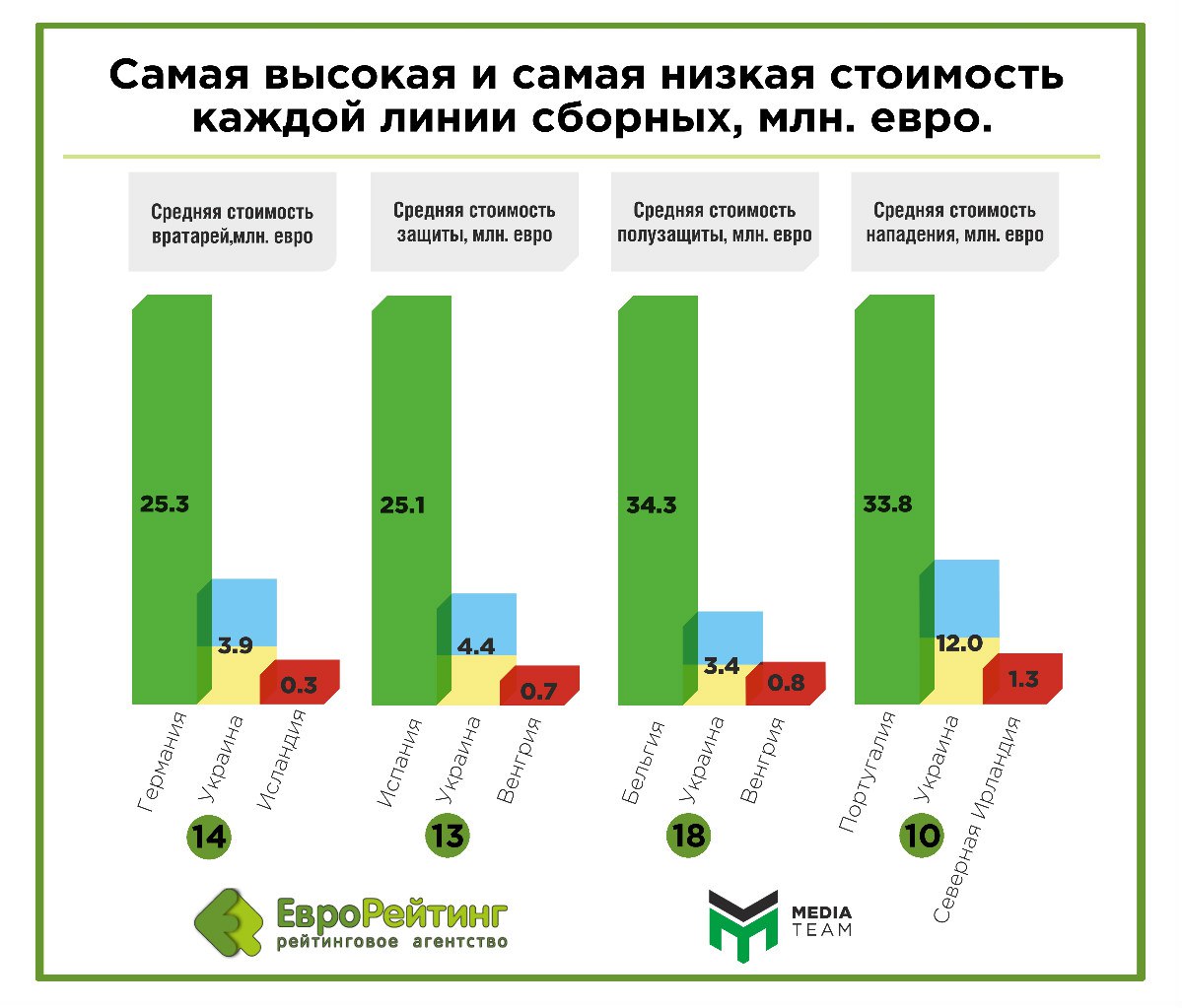 На приведенной диаграмме отражены наибольшее и наименьшее средние значения стоимости игроков по позицям. И место Украине- так же. На языке цифр имеем следующее: вратари – 14 место из 24, защита – 13, полузащита – только 18, нападение – 10. Добавим к этому, что в нашей группе находятся две команды, входящие в ТОП-10 по стоимости своих футболистов. При этом Германия ни в одной из номинаций не опускается ниже 5-го места. А Поляки уступают Украине лишь по ценности защиты.