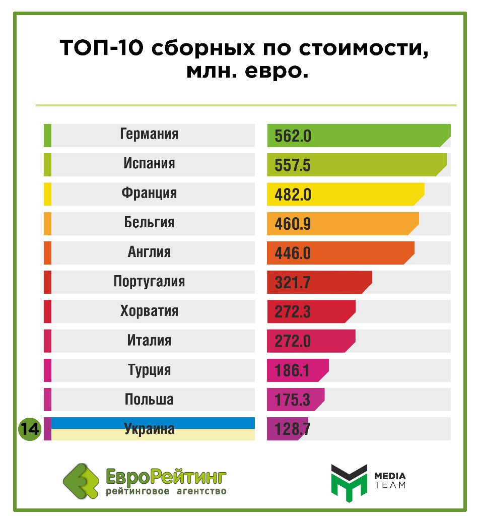 В ТОП-10 знакомые все лица: Германия, Испания, Франция и прочие Англии с Италиями. Среди пяти других сборных есть и такие, которые не рассматриваются, как явные претенденты на победу и даже не являются завсегдатаями чемпионатов Европы. Речь идет о Бельгии, Польше, Турции, которые именно к нынешнему первенству подходят во всеоружии. По крайней мере, дорогих игроков в их составе много. Хотя, у тех же поляков один Левандовский стоит как половина сборной. Что касается Украины, она занимает 14 место, находясь в своеобразной «золотой середине»: и не очень дорого и не так чтобы дешево.
