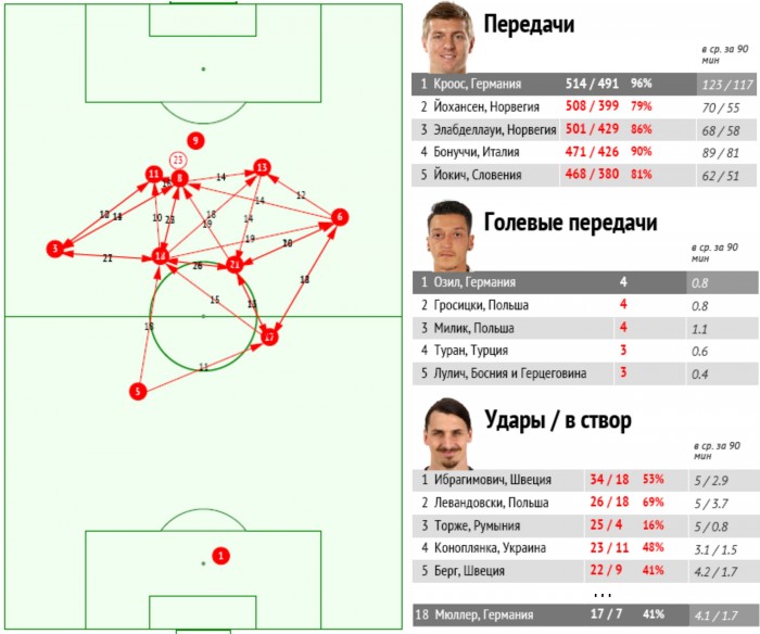 По итогам матчей заключительной части отборочного цикла Евро-2016 (с июня прошлого года) игроки сборной Германии Кроос и Озил стали одними из лучших по показателям общего числа передач и голевых пасов соответственно. Наибольшее число ударов по воротам за этот же период совершил Мюллер.