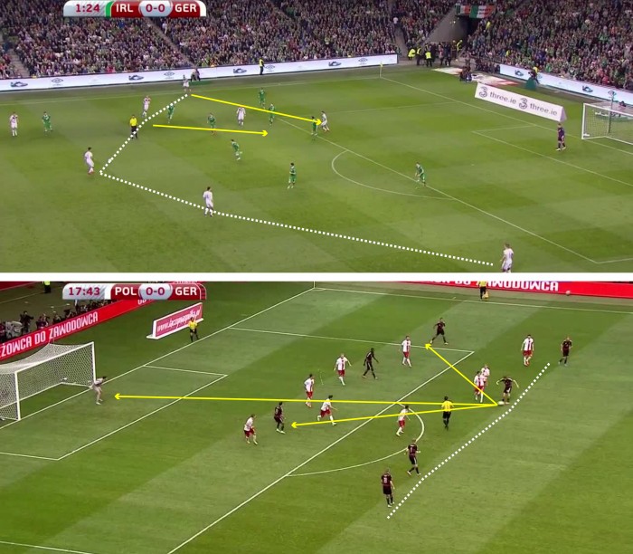 Широкий позиционный розыгрыш Германии у штрафной соперника (вверху) и большое число участников комбинаций на завершающих фазах (внизу).