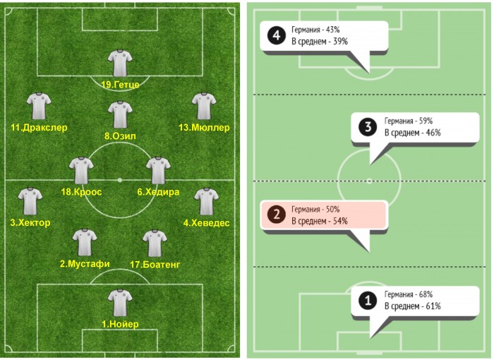 Предполагаемый состав немецкой сборной на игру в версии издания «Kicker». Справа приведена результативность единоборств команды по зонам поля. Явно наблюдается более низкий успех борьбы во второй четверти, где Германия в среднем уступает участникам турнира. Это тоже является аргументом в пользу активной контригры в этой части поля.