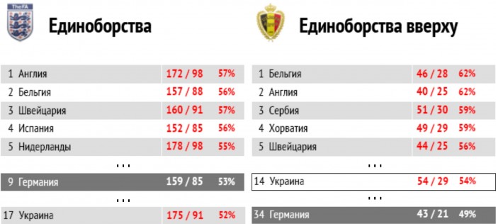В успехе персональной борьбы игроки Германии уступают многим командам, в частности в верховых единоборствах - Украине.