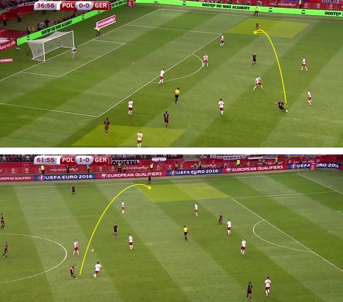2. В обороне фланговых зон на своей половине поля особое внимание следует уделить контролю флангового пространства в глубине. В эти зоны большое число диагоналей выполняют опорные полузащитники, в частности Кроос. Ярмоленко и Коноплянке следует добросовестно отходить в глубину обороны для страховки Федецкого и Шевчука/Бутко. Нападающие Германии много перемещаются по ширине поля и постоянно создают ситуации «2 в 1» или «3 в 2», которые завершаются острыми прорывами и подачами в штрафную.
