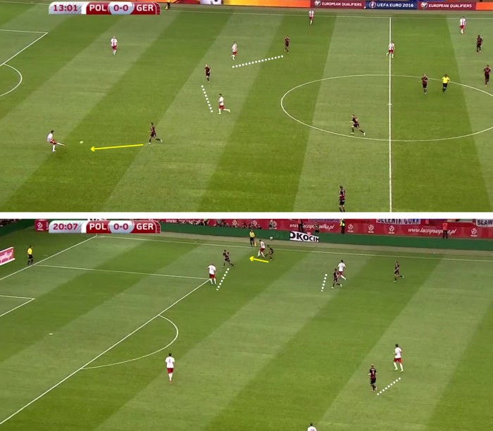 Кроме того, можно постоянно отправлять в высокий прессинг одного из центральных полузащитников. Как видно на видеофрагменте выше, сборная Германии редко проводит быстрые встречные атаки малыми силами, предпочитая позиционный розыгрыш. В большинстве случаев у центральных полузащитников будет время для отхода в оборону, однако «добро» на отборы на чужой половине поля они должны получить.