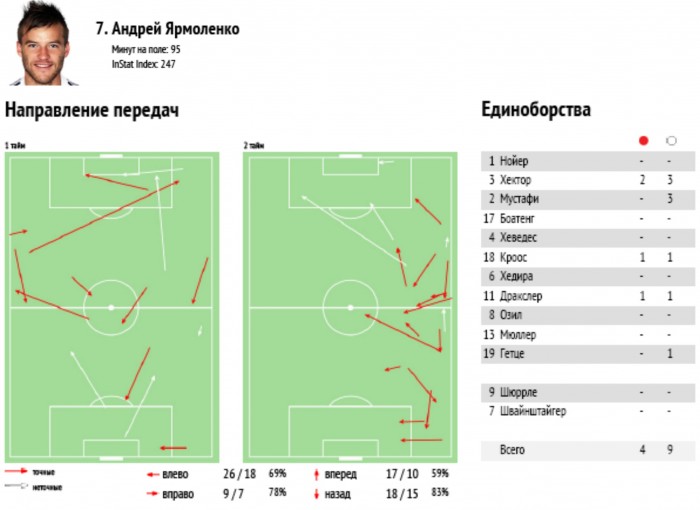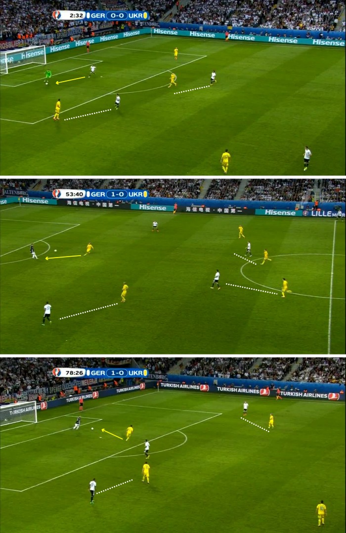 С другой стороны команда Фоменко максимально упростила варианты доставки мяча в атаку. Это было важным в противостоянии такому сопернику, как Германия, игроки которой часто практиковали высокий прессинг. О том, что наша команда радикальным образом изменила способ выхода в атаку, свидетельствует число длинных передач (53 за матч) и уменьшение роли Степаненко и Сидорчука, которые являлись на данной стадии ранее одними из основных игроков