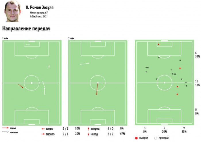 За матч Зозуля выполнил только 7 передач, и лишь 2 точно. В атаке им проиграно 73% борьбы, и успешно приняты лишь 3 верховых передачи за матч.
