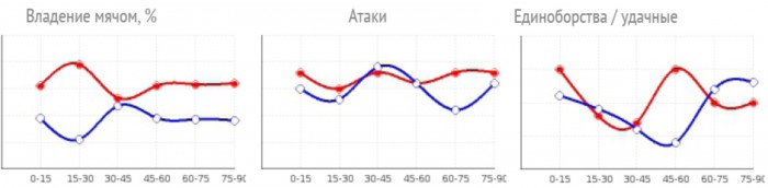 В графиках динамики изменения основных игровых показателей хорошо видно, как Украина перехватила игровую инициативу на исходе второго тайма. Основой для этого стал успех нашей команды в борьбе.