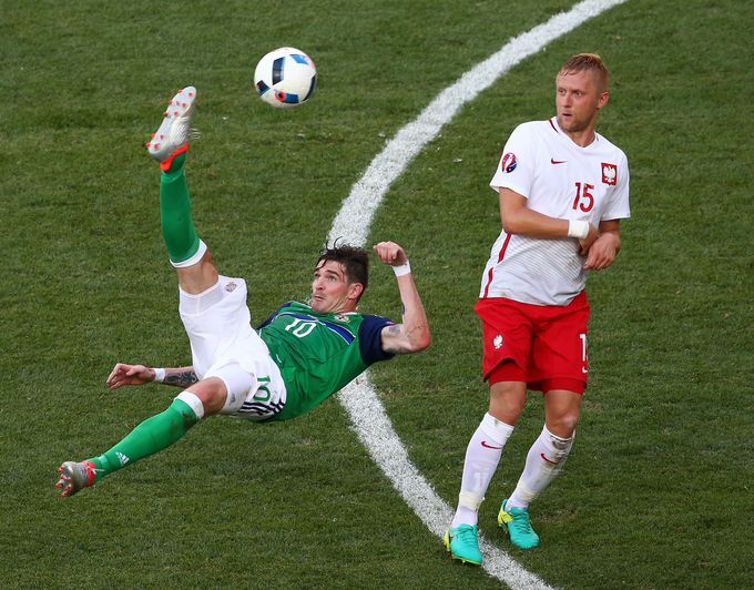 Судя по всему, адекватной замены Бранту О'Нил не нашел, потому решил перейти на схему 3—5—2. При этом, латерали – Даллас (слева) и Маклафлин или Макгинн (справа) отвечали за всю бровку. Мне кажется, постоянные перестроения с игры в четыре защитника на три не пошли Северной Ирландии на пользу – у них нарушаются связи между латералями и центральными защитниками. Поэтому на флангах защиты у них возникает несогласованность, которой можно воспользоваться. Хавбек сборной Польши Блащиковски, на мой взгляд, показал, как нужно пользоваться неслаженностью Северной Ирландии на левом фланге обороны, затерзав своего оппонента. Левому центральному защитнику – Эвансу, рост которого под метр 1.90, тяжело противостоять юркому хавбеку.