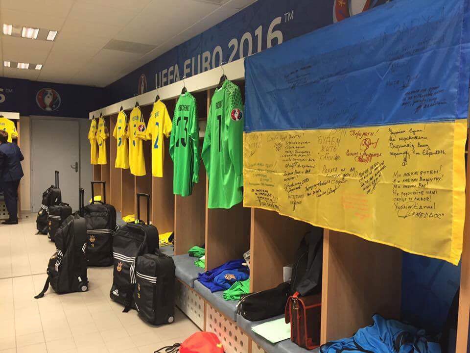 18:15. Фото из раздевалки сборной Украины. Украинский флаг с пожеланиями игрокам сборной - на почетном месте!