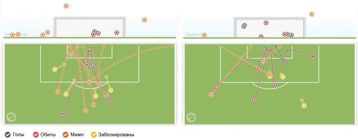 Тут как говориться «все покажет игра», к чему, в общем, добавить нечего. Нам же лишь хотелось подчеркнуть факт низкой эффективности на завершении. Те же поляки в матчах против ирландцев тоже не слишком преуспели в точности (25% в створ). Однако за матч они нанесли 16 ударов, из которых 6 оказались заблокированы. Таким образом, невысокую точность в данном случае, прежде всего, следует отнести к эффективной работе защиты соперника, удачно игравшей под мяч на перехвате.