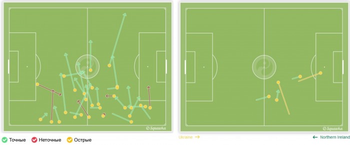 Практически полное отсутствие остроты в действиях Ярмоленко против Сев.Ирландии (слева) – еще одно подтверждение проблем в тактической организации Украины на выходе в атаку. Игрок регулярно был вынужден принимать мяч в борьбе или под опекой и имел мало вариантов выше себя. Как следствие – постоянная игра поперек поля и назад. При средней точности и числе передач, Ярмоленко не выполнил ни одного ключевого паса в атаку за матч. Справа приведена диаграмма передач в том же матче Зинченко, который отыграв лишь 13 минут на позиции в центре успел выполнить 2 обострения и ни разу не потерял мяч.