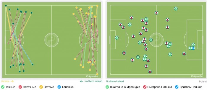 Справа представлена удивительная статистика верховых единоборств в матче Польша – Сев.Ирландия. Во-первых, на себя обращает внимание подавляющее преимущество поляков в игре длинными мячами – борьба за них в основном велась на половине поля ирландцев. Тем лучше видно, насколько поляки опасны в игре в воздухе и в атаке, и в обороне.