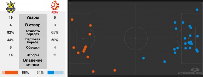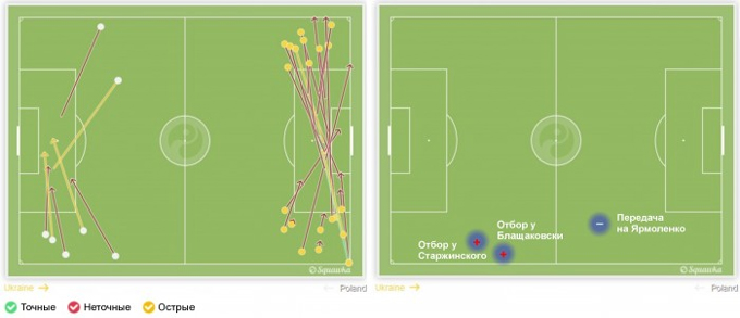При этом нельзя говорить о том, что поляки сознательно отдали инициативу нашей команде. Как и в других встречах, они начали игру крайне агрессивно, постоянно оказывая давление на самых ранних стадиях развития наших комбинаций. В дебюте игры впору было надеяться лишь на то, чтобы его выдержать, поэтому к первым достижениям Украины в этом матче можно отнести перехват игровой инициативы, которую наша команда затем прочно удерживала. Именно за счет подключения Ротаня к взаимодействиям в составе атакующей группы, а также креативных действий вышедшего, наконец, в стартовом составе Зинченко, мяч постоянно находился не только под контролем сборной Украины, но и на половине поля соперника.