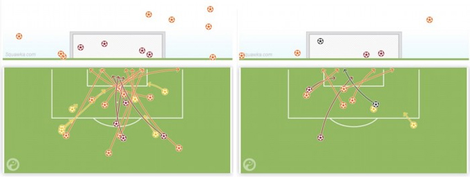 «Тепловая карта» действий Ротаня (слева) выглядит как «два сердца», которые с его появлением получила Украина в этом матче.