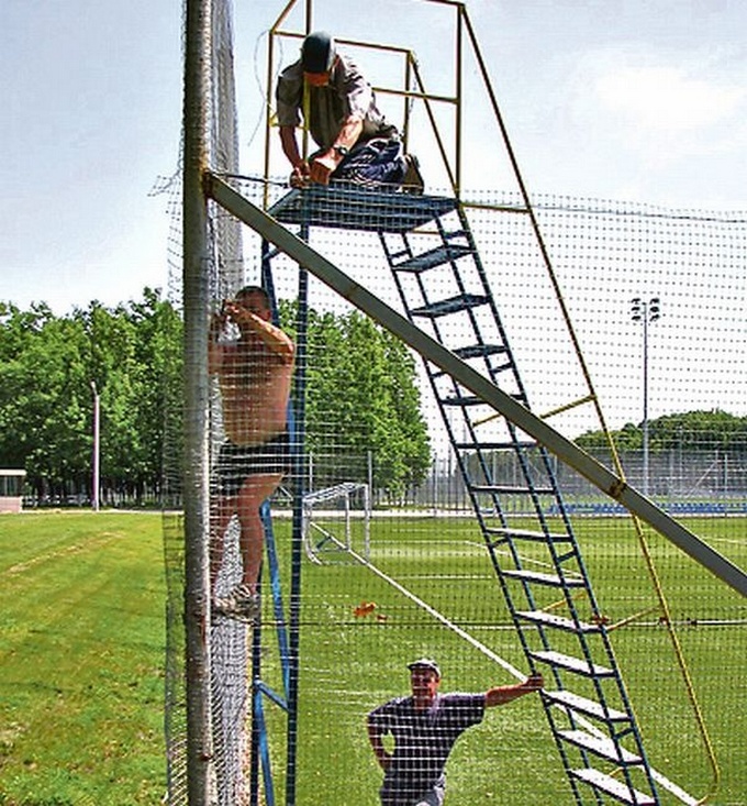 ПОД ЗАМКОМ. Первый человек в этих краях попадается нам уже на КПП спортивной части базы. Доброжелательный мужчина представляется охранником Сергеем и сразу успокаивает: здесь все под присмотром. «Охрана есть и на КПП, и в главном здании, обходы периметра делаем регулярно, — уверяет Сергей Лазука, который работает здесь охранником около года. — Все номера в здании закрыты, а ключи находятся у начальника охраны. Да и не было даже намеков на то, что кто-то может здесь что-то украсть». В том, что все ограждения целые, наш собеседник предлагает убедиться воочию, пройдясь по периметру ограждения. Забор и в самом деле сомнений не вызывает — нигде не пролезть даже собаке, а вот на крайних воротах мы заметили любопытную деталь: на замочной цепи явно недостает звеньев, поэтому ее скрепили обычной металлической проволокой.
