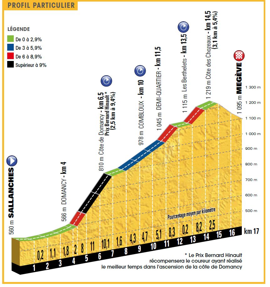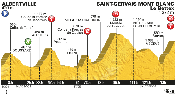 На этом этапе эмоции будут кипеть с самого старта. На гонщиков ждут сразу четыре подъемы: ColdelaForclazdeMontmin (1 категория, 9.8 км, 6.9%), ColdelaForclazdeQueige (2 категория, 5.6 км, 7.8%), MonteedeBisanne (HC, 12.4km, 8.2%) и Saint-GervaisMontBlanc (категория 1, 9.8km, 8%), на котором находится финиш. Атаки основных претендентов на победу на Тур де Франс можно ожидать только у подножия Сен-Жерве Монблан.