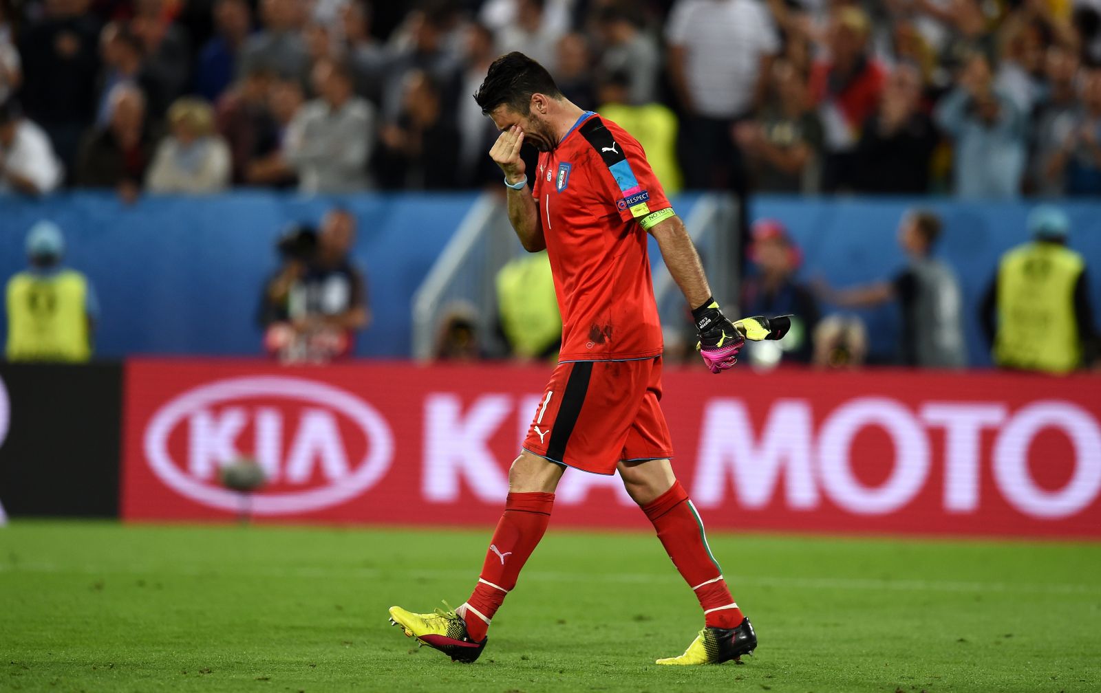 Голкипер и капитан сборной Италии не смог сдержать слез после поражения «скуадры адзурры» в четвертьфинале Евро-2016. 38-летний вратарь, который совершил несколько фантастических сейвов по ходу матча, проиграл серию пенальти, хотя был близок к тому, чтобы взять решающий удар Хектора: