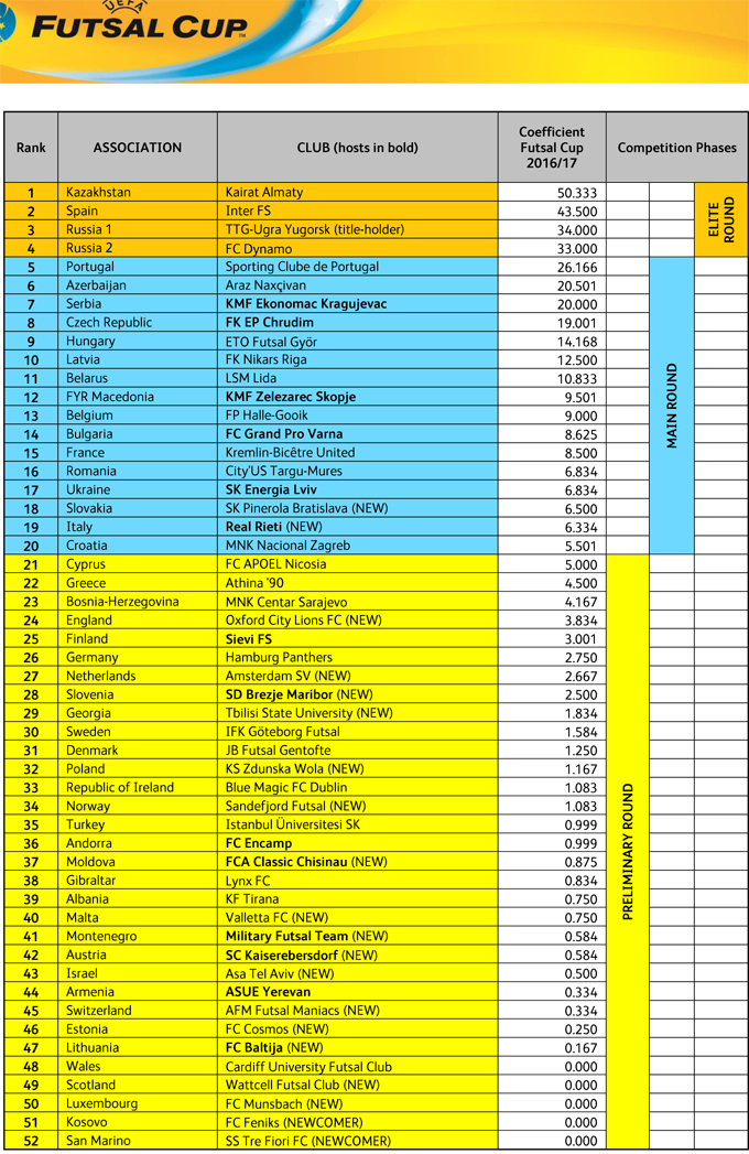 «Газпром-Югра» и еще три команды с лучшим рейтингом («Кайрат», «Мовистар Интер» и «Динамо») получили прямые путевки в элитный раунд, тогда как остальным уготована борьба в предварительном и основном раундах. Жеребьевка этих стадий пройдет 7 июля в Ньоне и будет транслироваться в прямом эфире на UEFA.com. В предварительном раунде сыграют команды 32 ассоциаций (занимающие в рейтинге места с 21-е по 52-е), включая «Феникс» из Косово и «Тре Фиори» из Сан-Марино. Еще 16 клубов начнут борьбу в основном раунде.