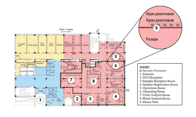 Пробы российских спортсменов передавали из шестой комнаты в пятую. Жирным показан защищенный периметр здания