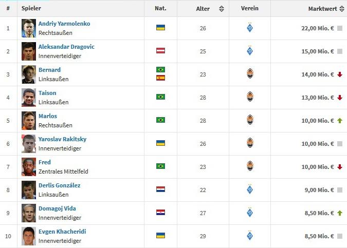 Четыре года назад один футболист Премьер-лиги в среднем стоил 1.29 миллионов евро. Сейчас же стоимость футболиста, выступающего в элитном дивизионе, упала до 1.14 миллионов. Самым дорогим футболистом остается Андрей Ярмоленко. В тройку вошли также Александар Драгович и Бернард. Однако стоимость этих футболистов за последние полгода нисколько не выросла, а вот Марлос и Домагой Вида повысили на себя цену, если верить оценкам авторитетного портала Transfermarkt.de.