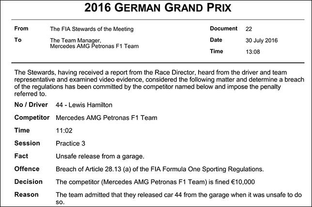 Рассмотрев обстоятельства инцидента, произошедшего в начале утренней тренировки, когда в Mercedes выпустили Льюиса Хэмилтона на пит-лейн в тот момент, когда сзади подъезжал возвращавшийся в боксы Роман Грожан, стюарды Гран При Германии обвинили команду в небезопасном выпуске машины и наказали денежным штрафом в 10000 евро.