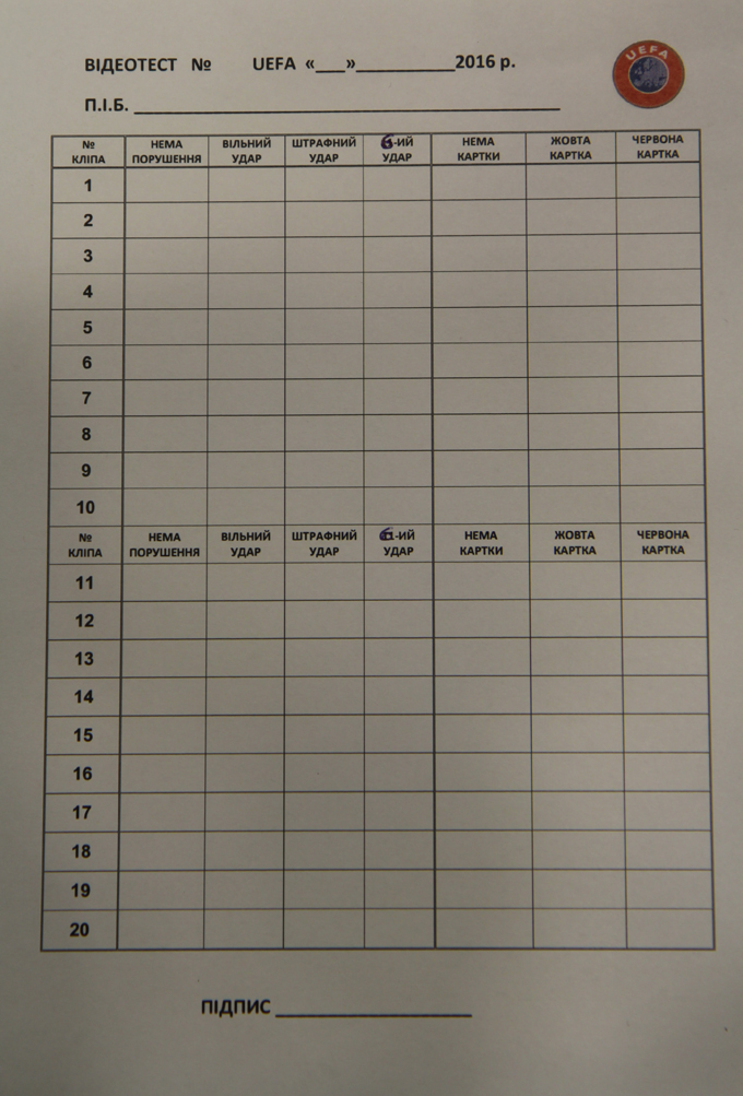 Первый день сбора – самый насыщенный, ведь по продолжительности с перерывами тестируемым предстояло работать в течение 12-ти часов. Самый ответственный момент для арбитров был в начале рабочего дня – это два тестирования. Первое – по Правилам игры в футзал, в котором нужно было в течение 12-ти минут ответить на 12 вопросов, в ответах на которые были 4 варианта, но только один правильный. Второе же – видеотест УЕФА, в котором арбитрам нужно было дать оценку 20-ти различным игровым эпизодам из конкретных матчей национальных чемпионатов разных стран и международных турниров. Задача была, прямо скажем, непростая – ведь арбитрам нужно было найти правильную трактовку эпизода практически в «боевых» условиях, при цейтноте времени, причем еще и нужно было абстрагироваться от того решения, которое приняли арбитры на конкретном видеофрагменте, а оно не всегда было правильным. Нагрузка при этом тестировании была столь высокая, что после его окончания по общей просьбе арбитрам был дан перерыв.