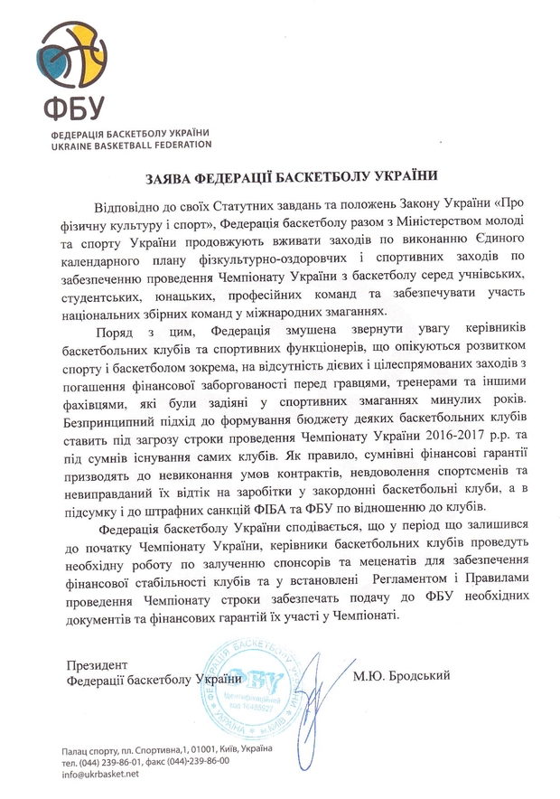 Федерація баскетболу України звернулася до клубів-боржників із заявою. У ній Президент ФБУ Михайло Бродський висловив стурбованість щодо безпринципного підходу до формування бюджету баскетбольних клубів. Це ставить під загрозу строки проведення Чемпіонату України 2016-2017 років та під сумнів існування самих клубів-боржників.