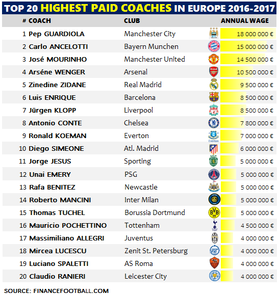 Возглавляет рейтинг наставник «Манчестер Сити» Пеп Гвардиола с окладом в 18 миллионов евро. Интересно, что Карло Анчелотти, сменивший Пепа в «Баварии», получает 15 миллионов евро. На третьем месте тренер «МЮ» Жозе Моуриньо с зарплатой в 14,5 миллионов евро.