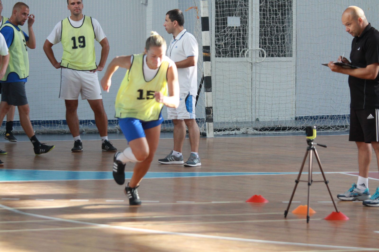 - В тестировании у арбитров было три задания. Первое – тест на быстроту движения, нужно пробежать 2 отрезка по 20 метров и уложиться в 3,4 секунды. Второй – на технику передвижения, он включает челночный бег 10 метров, приставным шагом 8 метров от фишки до фишки, и гладкий финиш 10 метров. Т.е., 36 метров нужно было пробежать за 10,1 секунды. И самый важный тест – тест на выносливость, который включает бег 9 минут 5 секунд или 1170 метров. Тут был бег на отрезки по 20 метров с коротким временем на отдых, бег на 12,5 метров приставным шагом, который чередовался ускорениями приставным шагом.