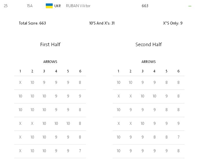 Украинский лучник Виктор Рубан занял 25-е место в квалификации индивидуальных соревнований, набрав 663 очка.