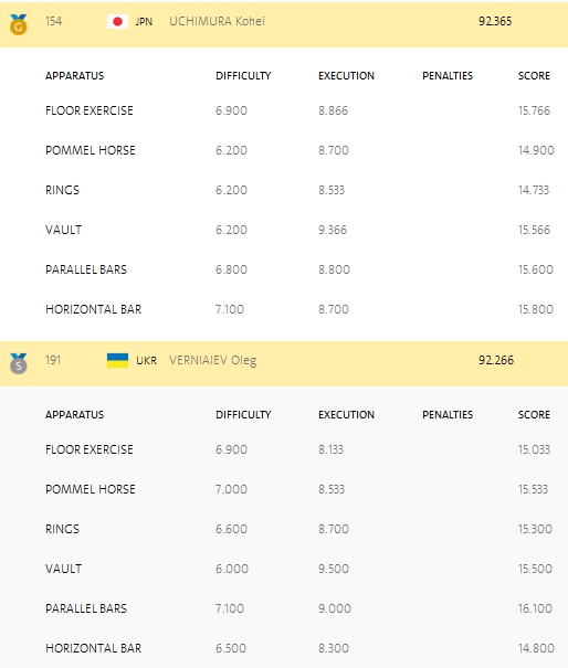 Чемпионом Олимпиады стал Кохе Утимура, набравший сумму 92,365, результат Олега – 92,266. Третье место у британца Макса Уайтлока – 90,641.