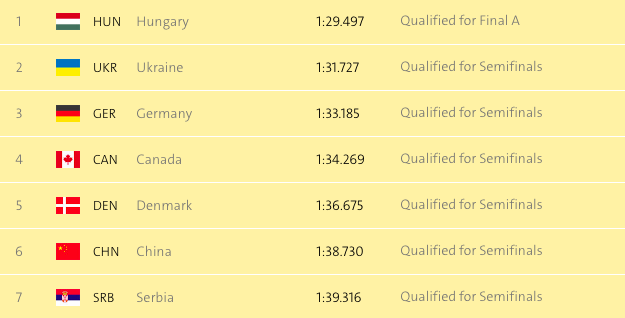 В предварительном заплыве украинки финишировали вторыми,проплыв 500 м за 1:31.727. Этот показатель стал третьим в общем зачете.