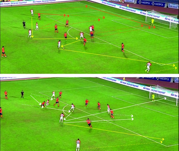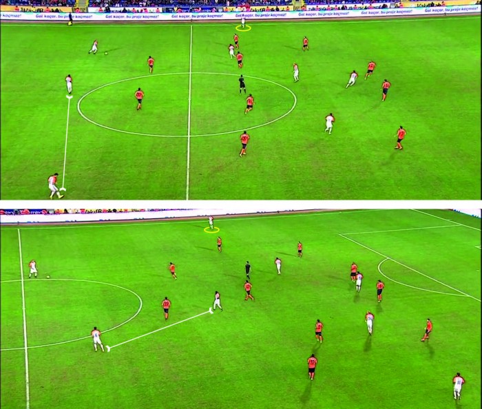 Теперь тот же Исмаили постоянно смещается в центр еще до достижения атакой глубины. Основной целью обостряющей стадии комбинаций «Шахтера» стала доставка мяча в центральную зону перед штрафной (штрафной сектор или «дуга»), откуда выполняется проникающий пас или удар (6 из 13 против «Истанбула» – почти половина). Вариантом является почти поперечный перевод мяча вдоль лицевой линии штрафной с последовательным включением игроков, и охватывающая комбинация строится в так называемом «веерном» стиле. Поэтому сказать, что от изменения игры команды, в том числе на ключевых стадиях Фонсека отказался, конечно же нельзя.