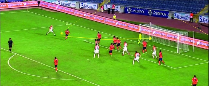 Угловой справа подает левоногий Марлос, мяч целенаправленно облетает всю штрафную к Ракицкому, который заносит ногу почти в ожидании и наносит удар слета. Бегущий к нему соперник уже опоздал.