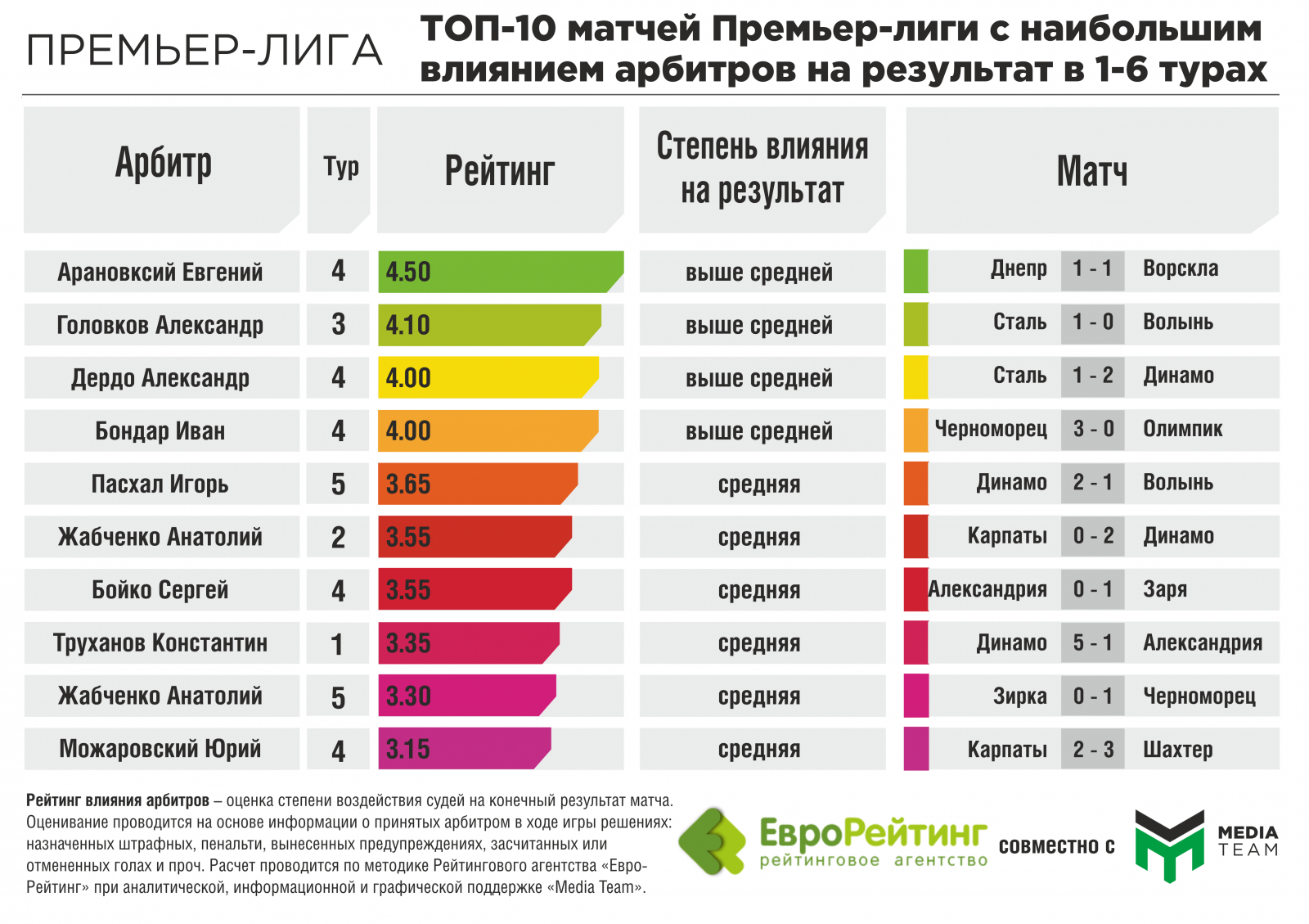 Рейтинг влияния арбитров – оценка степени воздействия судей на конечный результат матча. Оценивание проводится на основе информации о принятых арбитром в ходе игры решениях: назначенных штрафных, пенальти, вынесенных предупреждениях, засчитанных или отмененных голах и проч.
