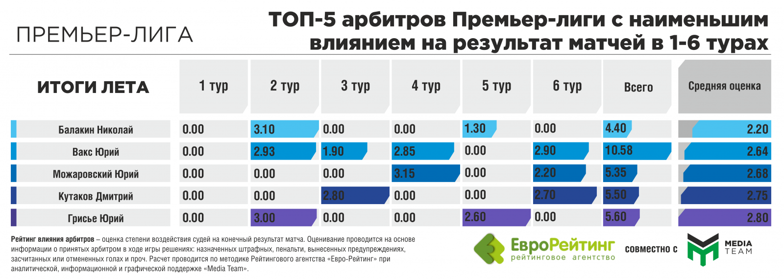 Говорить о качестве работы кого-то из арбитров по 2-3 играм – преждевременно. Очевидно, что более точная картина будет по итогам первого круга чемпионата. Заметим лишь, что в оба ТОПа не были включены судьи, проведшие по 1-му поединку. С полным рейтингом арбитров по итогам 6-ти туров, можно ознакомиться на сайте Рейтингового агентства Евро-Рейтинг.